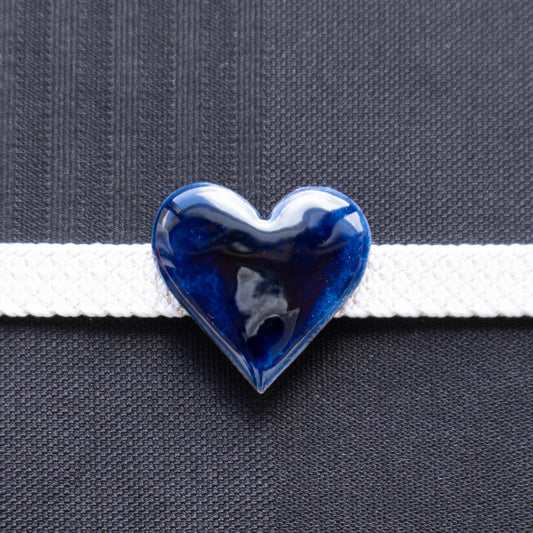 肌に当たるのは0.3mmの銅の縁だけ。それ以外はガラス質の釉薬と真鍮製の帯留金具で、金属アレルギーが起こりにくい構造です。敏感な方にも安心して選ばれています。