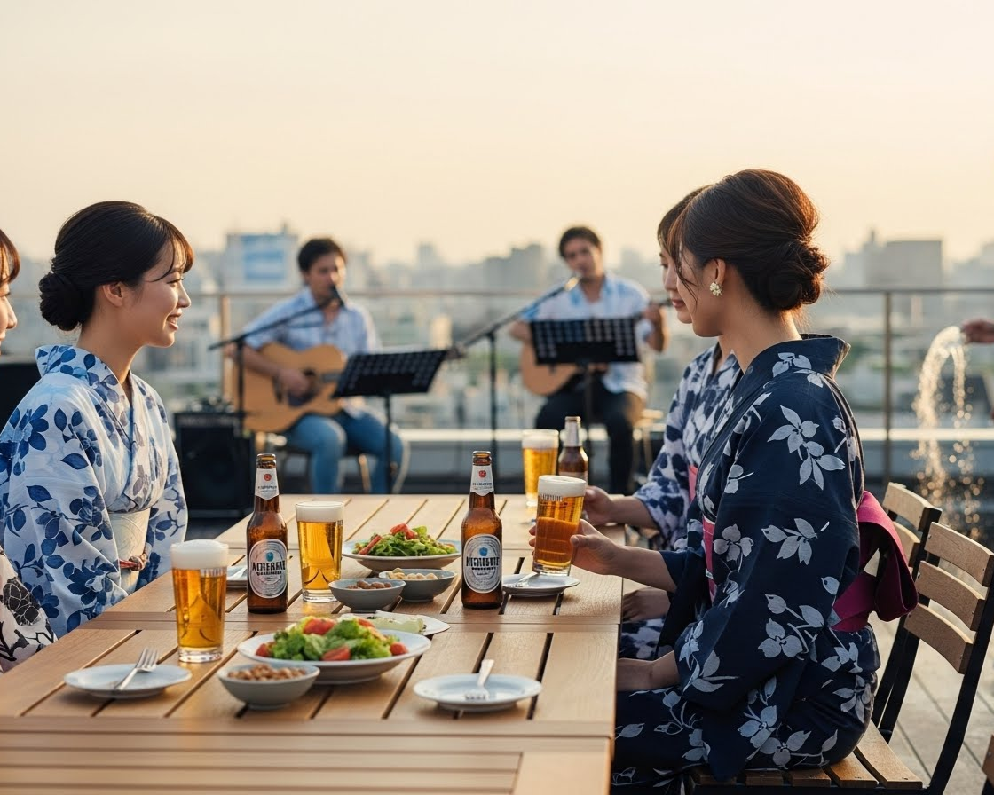 - 同僚と浴衣でビアガーデンに行ったら、ちょっとしたライブが行われていた。